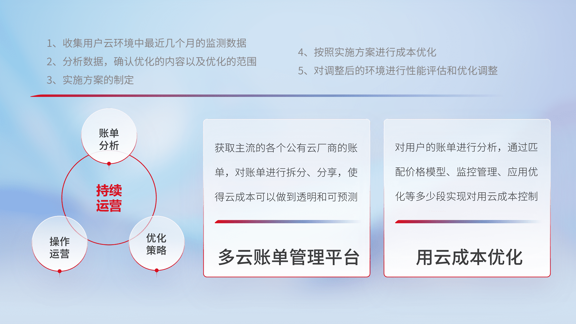 通过多云纳管,,以统一的资源数据模型把客户的云资源进行抽象和封装,,,进而实现对多云资源的统一操作,,,保障云资源管理的可靠性、、、、稳定性与可用性。。量身定制化运维内容,,,,配置、、、、开发运维、、、、补丁管理、、备份、、、、监控、、、、认证和访问管理、、、审计和日常巡检等,,,,保障在用云过程中的可靠度,,,,稳定度以及高可用率。。
